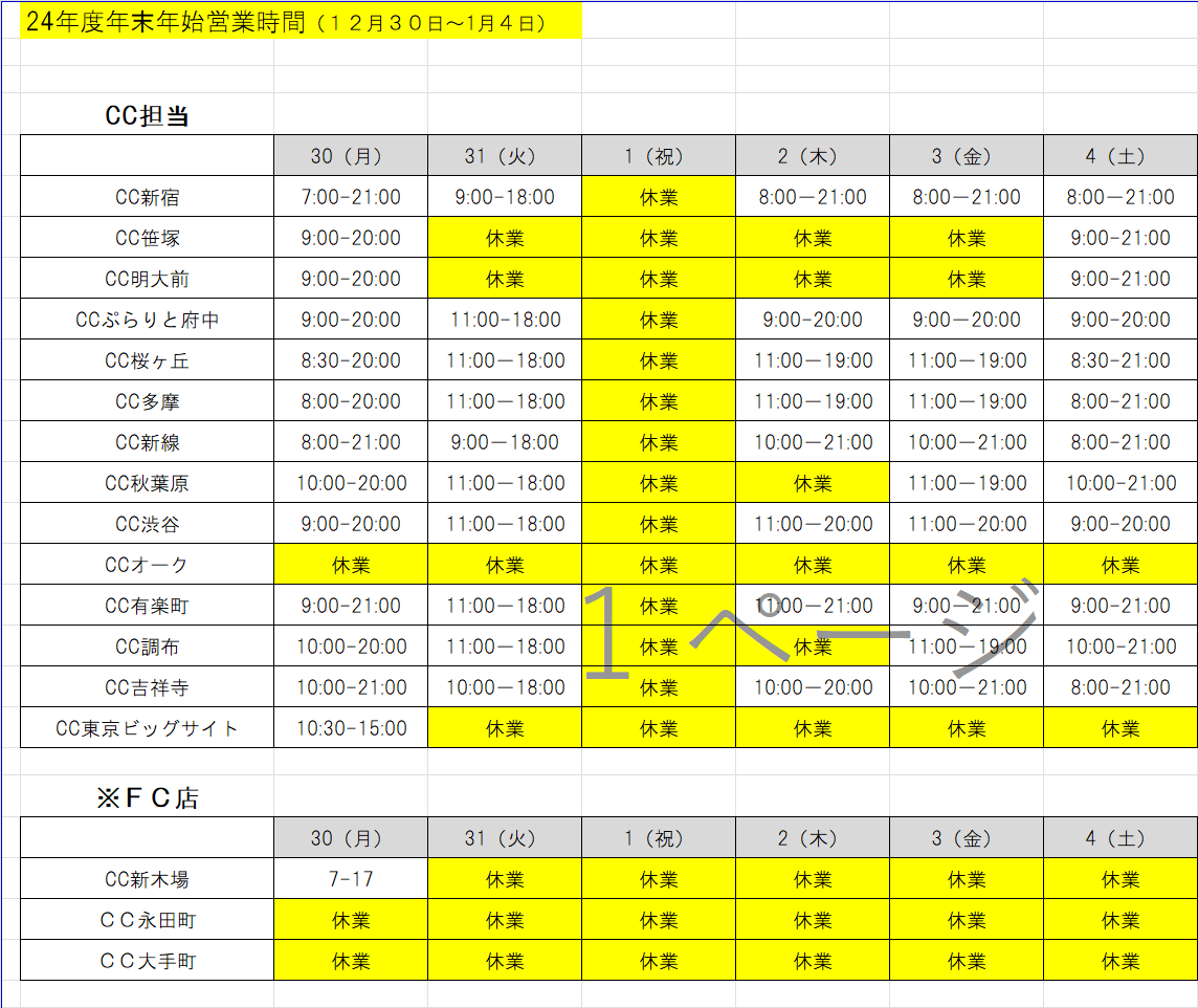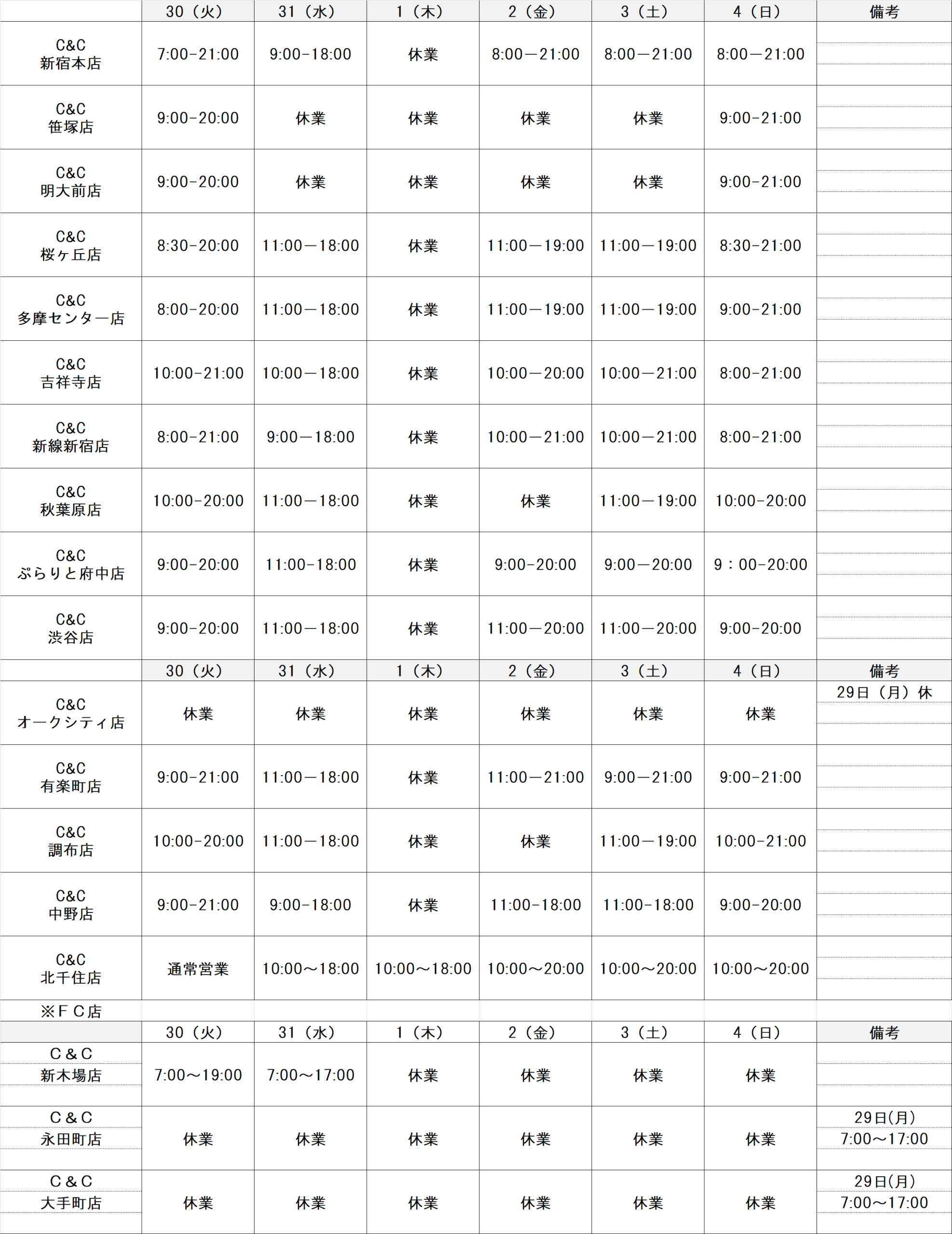 年末年始の営業時間を、下記のとおり変更させていただきます。